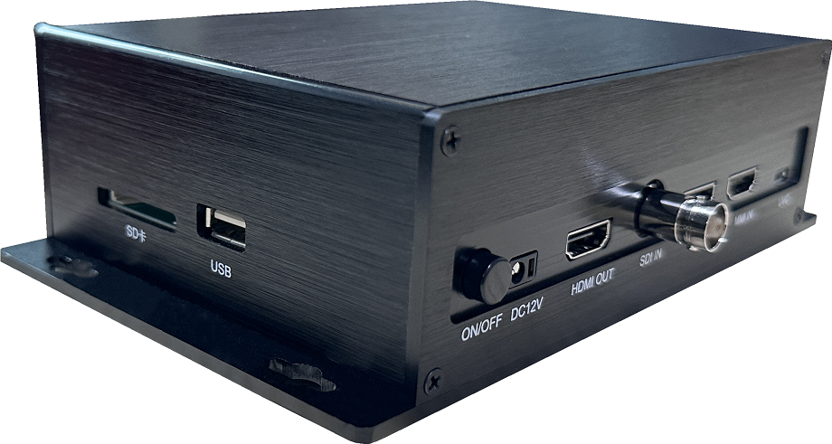 标准1U机箱,可置放机柜。具有HDMI、SDI、AV、VGA、色差输入录制接口,有HDMI输出接口。支持移动硬盘、SD卡录制。配有遥控器、也支持机身面板按键录制。