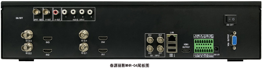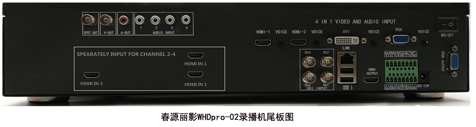 WHR系列产品,具有4个视频输入通道,有HDMI输入接口的机型,从1个HDMI输入到4个HDMI输入,共有10款产品。每款产品的每个HDMI输入接口,不仅支持HDMI含音频录制,还分别有一个莲花音频输入接口,可以将HDMI含有的音频以及莲花接口输入的音频与视频同步混合录制下来。当HDMI不含音频时,可以从莲花接口配音录制。