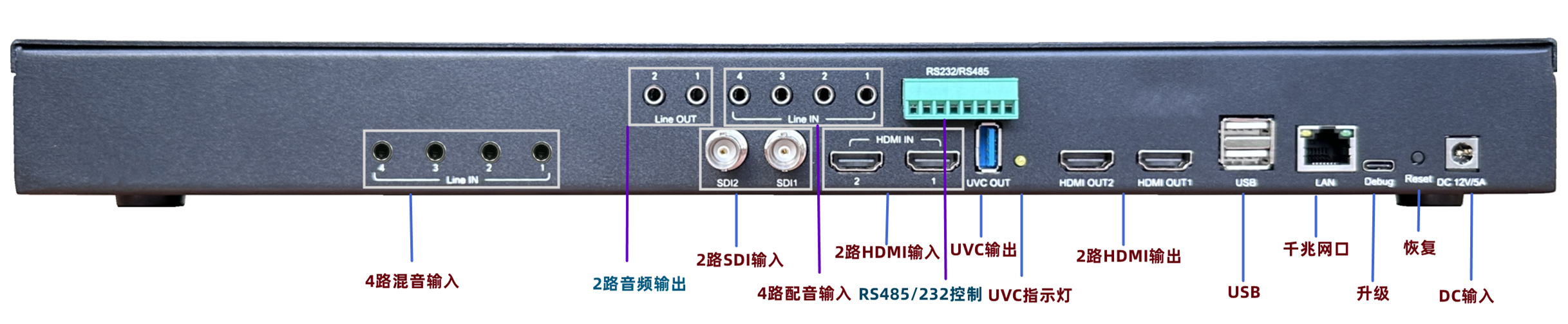 配音接口:设有4路3.5音频输入接口,能够为4路物理输入通道提供配音功能。
