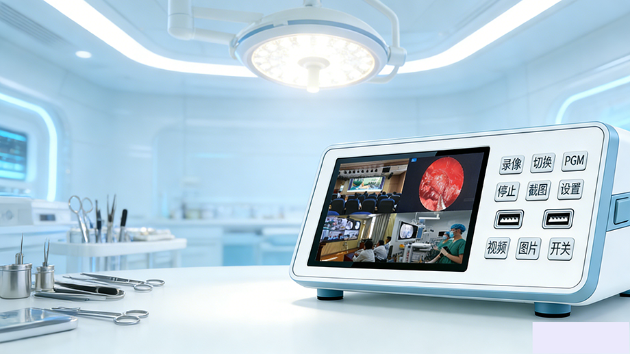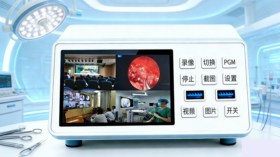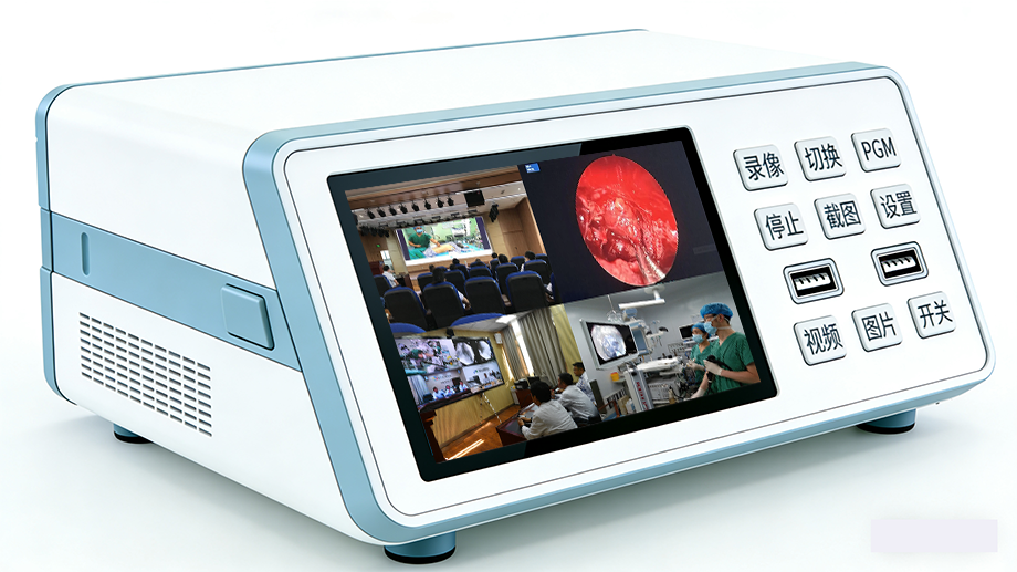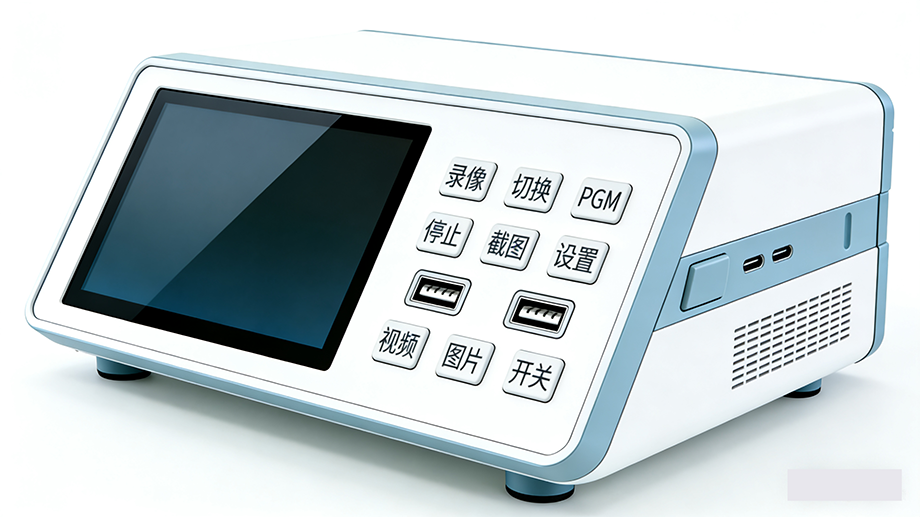 • 交互前端:正面配备一块7英寸高亮高清电容触控屏,支持10点触控,反应灵敏。面板集成实体按键,包括一键录制/停止、截图、画面切换、导播模式快速入口、回放及设置键,并设有硬电源开关,确保在紧急或无菌要求下的可靠操作。