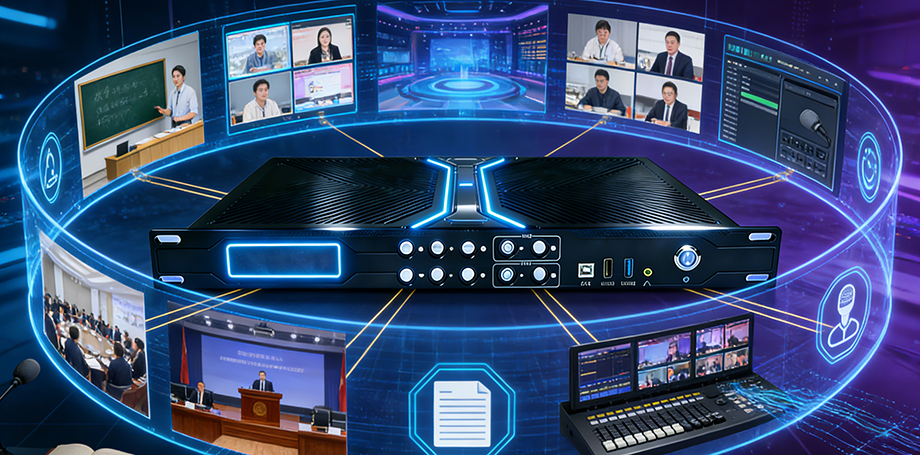 • 专业视听与内容创作:满足微课/慕课制作、虚拟演播、产品发布、培训录像等需求。广电级SDI输入确保专业摄像机信号无损接入,虚拟抠像与智能字幕功能大幅提升内容产出效率与成品质量。