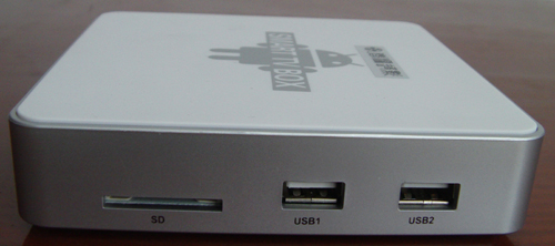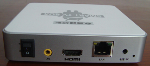 在机器后面板,从右向左依次为:硬电源开关、AV输出接口、1.4版本HDMI接口、 (RJ-45) 10/100M 网络接口;电源接口,5V、2A输入; |