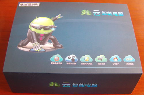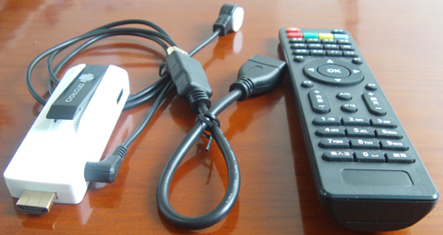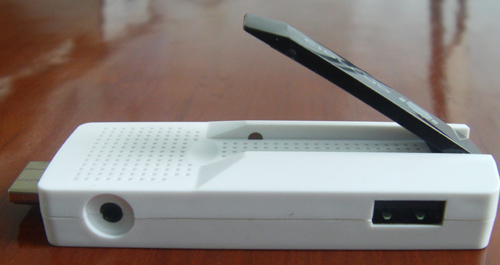 大拇指机型,采用精美钢化塑胶材料制作,整体乳色,显得典雅精巧。上下均匀点状散热孔,确保了机器的稳定使用。前面是HDMI插头,上面有一黑色可折叠峭立板式无线接收天线,左侧前面有一圆形遥控器远红外接收器插口,可以插入随机配送的遥控器接收器;左侧下面有2.0USB接口,支持插入无线鼠标接收卡、U盘、移动硬盘或者哈宝使用;右侧有迷你型USB接口,用于连接USB电源使用。