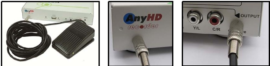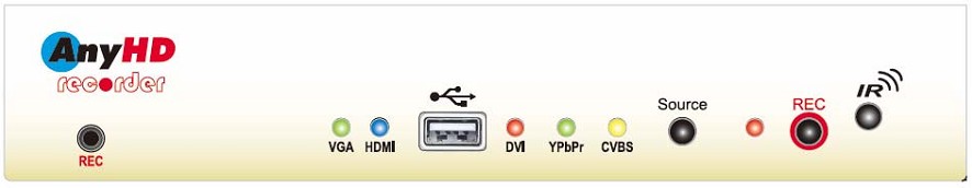 机器前面板显示端子全面。从左向右依次为:REC,脚踏板线接口,可以脚踏控制录像的开始、暂停、续录和停止录像,功能和右边的REC按钮一样。然后有 VGA、HDMI、DVI、色差、AV信号源指示灯,中间有USB接口,然后有SOURSE信号源调整按钮,LED工作指示灯,REC录像控制按钮,IR红外接收窗。