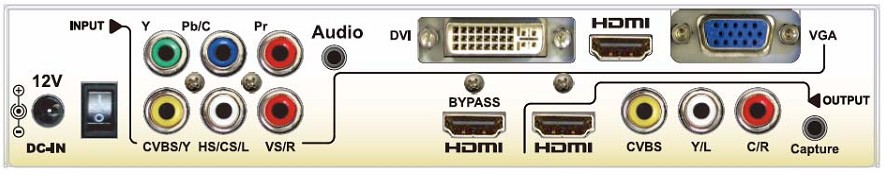 机器后面板输入输出端子更加丰富。从左向右依次为,12V电源插口,硬电源开关,AV、S端子、色差输入接口,立体声音频输入接口,DVI、HDMI、VGA输入接口。右下角依次有 BYPASS HDMI 即时显示输出端子,HDMI监视输出端子,AV输出端子,音频输出端子,CAPTURE 脚踏板截图控制线接口。