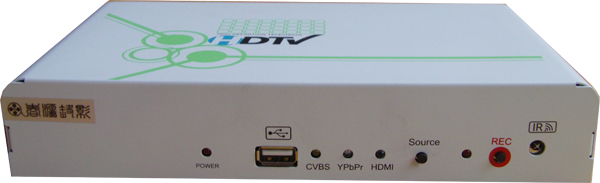 主机面板从左向右依次有 电源指示灯、USB插口、CVBS信号源指示灯、色差信号源指示灯、HDMI信号源指示灯、信号源切换按键、录像指示灯、REC录像按键、遥控器接收窗。