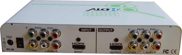 后面板具有丰富的接口,从左向右依次有12V3A电源插口、硬电源开关、上一排是色差输入接口、下一排是CVBS输入接口,一个HDMI输入接口;右边一个HDMI输出接口,上一排是色差输出接口,下一排是CVBS输出接口。