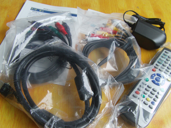 随机配件有 HDMI高清线、色差线、CVBS线、遥控器、电源适配器、说明书、保修卡等。