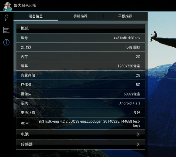 二、产品参数 1、芯片系统:采用RK3188四核超配硬件,安卓4.22最新系统。CPU 四组,每组1.4GB共5.6GB;DDR 2GB,系统内存2GB,GPU八核,FLS内存8GB。