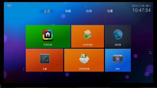 三、主要实用性功能 (一)、简洁的开机界面,可以随意将常用的软件端口进行人性化布局。 588F5B开机后显示的是四个基本端口分类,分别为主页、收藏、应用、设置。 每个端口下面布局了4-10个窗口,可以根据需要将常用的功能添加在相应的窗口,以方便快捷进入。 为帮助国内客人方便使用,出厂发货的时候,不仅给安装了常用的直播、点播、游戏等软件,而且将最实用的功能软件给添加在相应的端口了。同时,也将目前国内集合量最多的软件市场安装上了,如安卓市场、奇珀市场、沙发管家等,客人可以再根据自己的需要随意下载安装。客人购机回家即可便捷使用。 主页端口有6个窗口,左上角第一个窗口为系统嵌入固定窗口既“所有应用”不可改变,本机安装的所有功能软件都默认放在该端口。其他端口可以根据个人需要随意添加。出厂发货的时候,已经将主页端口的其他5个窗口给添加了上网最基本需要的登陆软件,如浏览器、APK安装器、系统设置以及文件浏览器、相机。如个人感觉不便,可以自己点击添加其他功能。