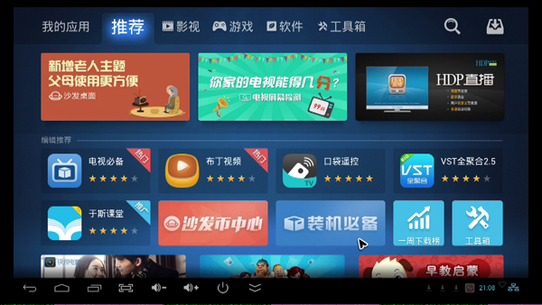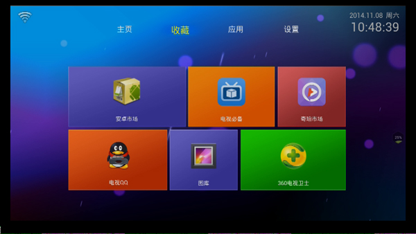 在收藏端口,出厂发货的时候,给添加了安卓市场、电视必备、奇珀市场、电视QQ、图库、360电视卫视。进入这个端口,可以在软件市场下载安装想要的功能。