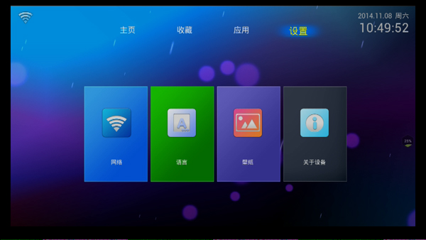 设置端口为系统默认嵌入,分别有网络、语言、壁纸、关于设备四项。