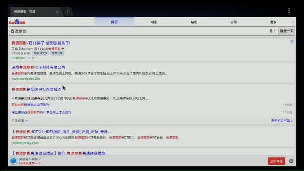 (三)、在线浏览器功能 588F5B支持最常用的的IE浏览器,也可安装其他各款浏览器。如电脑一样,用键鼠进行随意的网址输入、百度搜索、视频点播等功能。该功能在当前网络播放器屏蔽浏览器、严禁下载使用其他资源的形势下,具有特殊意义。因为即使不准各个视频网站开放APK端口,也可直接登陆视频网站如电脑一样进行点播欣赏。该功能是切实实在实用的功能,也只有588F5B这种配置的产品才可以真正的实现。而打开网页的速度,比常规台式电脑还要快的多。而其他芯片配置的网络播放器虽然有的也宣传有浏览器在线点播功能,但是因为其配置低系统落后,只是有名无实,没法使用。