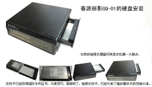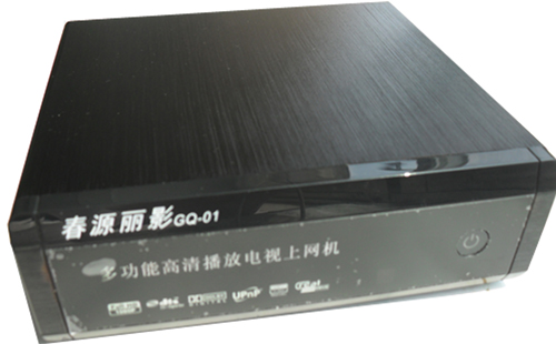 GQ-01主机,造型整洁大方,以方式宝盒为主概念。通体黝黑透亮,给人以沉稳的感觉。全机纯铝合金构造,高档典雅;拉丝玻璃磨砂面膜,线条匀称,细致入微;镜片面板,晶莹剔透,细腻质感。上围板仰视显出尊贵,烤印的“春源丽影GQ-01”显示出机器系出名门,面板清晰的“多功能高清播放电视上网机”的概念性机类,映射出该机器的庞大功能。