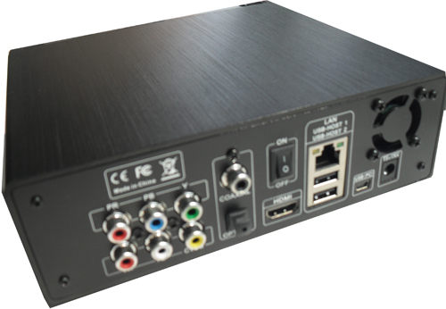 机器的后面板,嵌入了丰富的输出接口。从左向右,上面是3C认证标志,下面是色差输入、AV输入,中间位置,上面是同轴输出,下面是7.1光纤接口,右边上部是电源硬开关,下面是国际标准1.3HDMI高清输出,右边上面是LAN标准网口,下面两个2.0快速USB接口,再右侧上面是静音风扇,下面依次为连接电脑的USB接口、12V3A电源插口。