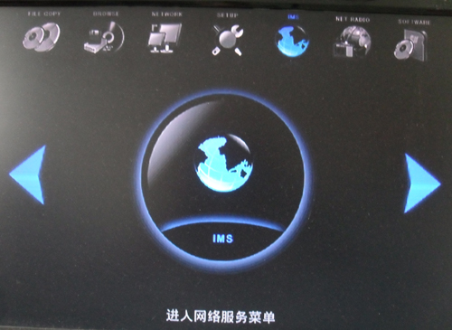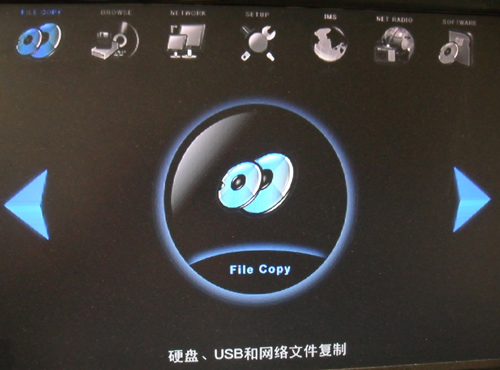 明晰科学的功能显示界面。从左到右依次显示为:硬盘、USB和网络文件复制、 浏览硬盘、USB和网络、浏览网络共享、进入设置菜单、进入网络服务菜单、收听在线广播、管理ftp、bt、等扩展软件等七大功能。