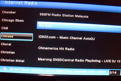 在线广播是GQ-01的另一个实用功能。只要打开该功能界面,全球各国家各地区的电台按字母顺序列表而排。例如 中国频道:Chinese 就有14个频率电台。网络电台对网速要求很低,1兆网速就可以了。加上GQ-01的立体声输出,音质优美,是个很好的享受。