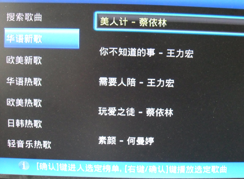 GQ-01的在线音乐功能也是该机器的一大靓点。连接网络后,海量的歌曲可以随便欣赏。依次列表为:华语新歌、欧美新歌、华语热歌、欧美热歌、日韩热歌、轻音乐热歌。由于GQ-01具有典雅的7.1声道立体输出,因此,对喜欢音乐的朋友是一大好消息了。