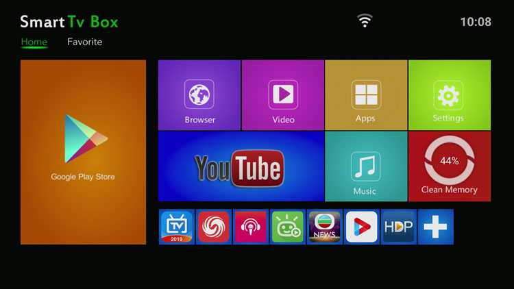 开机界面简单明了,全球各地通用。左边为谷歌应用市场,顶部第一行依次是浏览器、影视中心、应用中心、设置;中间为YouTube、音乐中心、缓存清理器。下面一行为常用APP快捷布置通道,客户可以将常用的如电视家、泰捷视频等直播、点播端口添加于此,可以添加10个APP。
