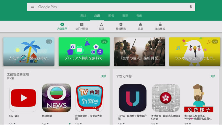 无论在谷歌市场还是沙发管家等安卓市场,可以任意下载视频点播客户端,如国内客户喜欢看的爱奇艺、优酷TV、腾讯视频、泰捷视频、电视猫视频等应有尽有。如你是视频客户端会员,则可以无障碍欣赏任何VIP高清电影大片。