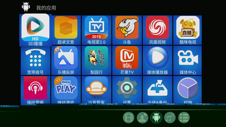 除了在下面一行布局常用的APP外,自己下载安装的各类常用的其他直播、点播APP可以自由添加在影视中心;自己喜欢的音乐APP添加在音乐中心,更加方便使用。