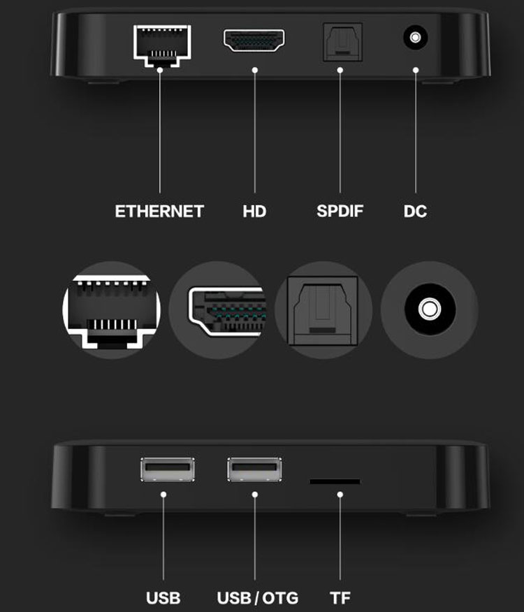 机器前面板中央除了有远红外遥控接收窗外,还嵌有晶莹LED时间显示灯,开机后更显科幻。机器尾板从左向右依次有千兆LAN自适应网口、2.0 HDMI高清接口、立体声光纤接口、5V2A电源插口。机器左侧有双USB接口和TF卡插槽。