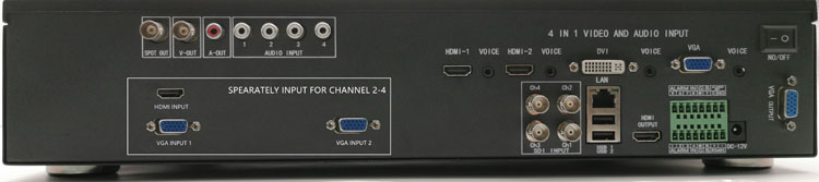 在四合一输入接口既第一通道输入四路高清音视频信号,同时将三路高清信号也通过HDMI一分二分屏器分别输入二、三、四通道,启动录像后,不仅会在第一通道实现了四合一录像既多路画面录制成一个音视频文件,而且另外三路也能独立录制为单独的音视频文件。
