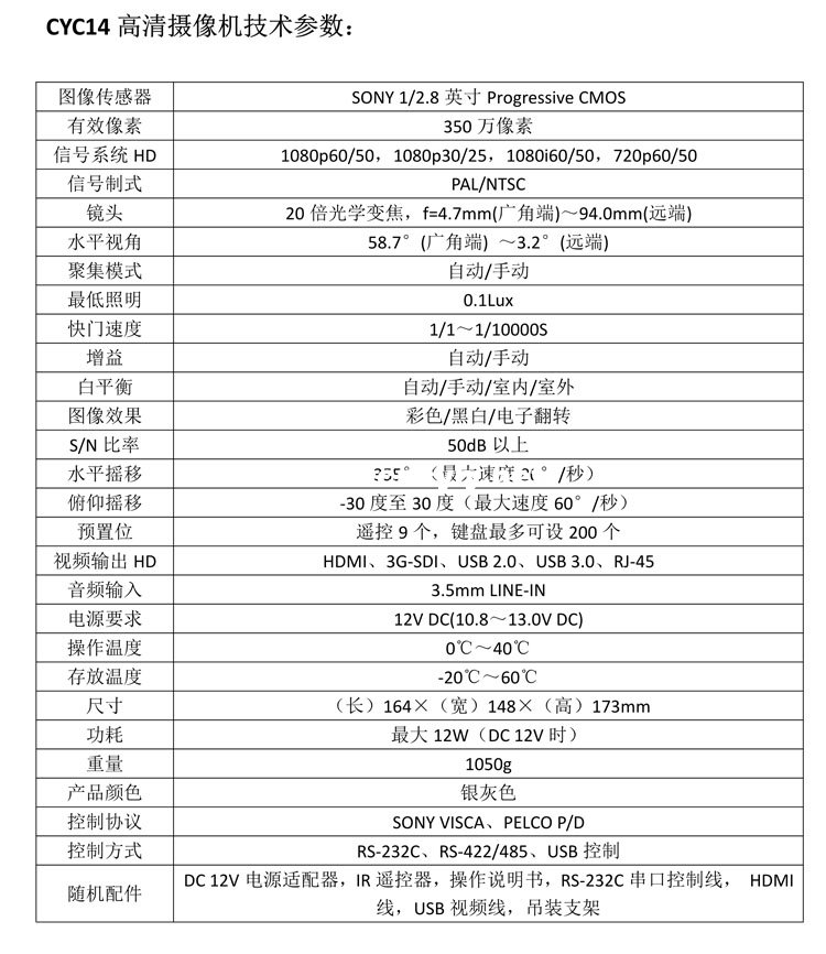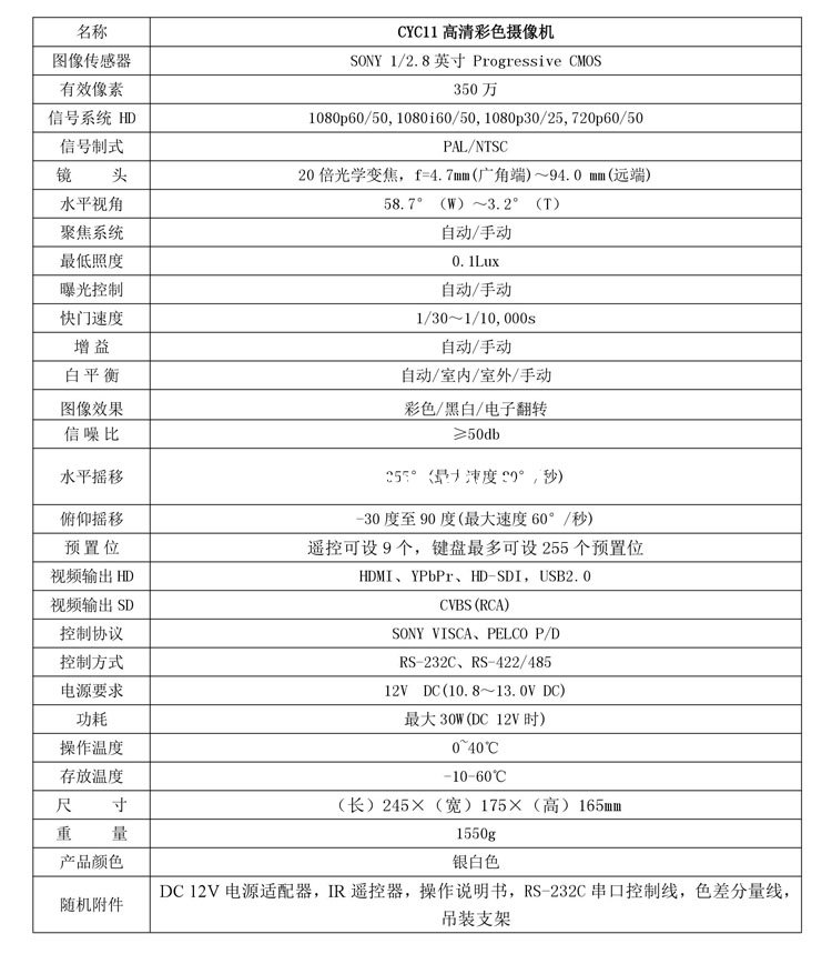 高清1080P 20倍视频会议摄像机CYC11机型是我司主要针对视频会议行业专业研发的通讯型彩色一体化摄像机。采用SONY 1/2.8英寸 Progressive CMOS 350万,最高分辨率通达到1080p/60/50,20倍光学变焦镜头,同时内置了高速全方位云台,使用户能清晰观察细小或距离较远的目标。视频会议摄像机采用一体化集成设计,外形美观,造型别致,结构紧凑,运行平稳,无噪音,定位准确,可靠性高,可长期稳定运行,使用方便,无须维护。采用RS-232多协议的通讯,桌面或吸顶安装方式,摄像机能够胜任视频会议或远程电视监控等多种用途。