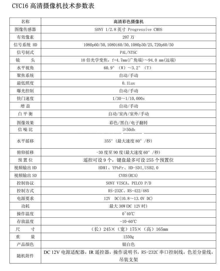 高清1080P 10倍视频会议摄像机CYC16是我司主要针对视频会议行业专业研发的通讯型彩色一体化摄像机。采用SONY 1/2.8英寸 Progressive CMOS 207万,最高分辨率通达到1080p/60/50,十倍光学变焦镜头,同时内置了高速全方位云台,使用户能清晰观察细小或距离较远的目标。视频会议摄像机采用一体化集成设计,外形美观,造型别致,结构紧凑,运行平稳,无噪音,定位准确,可靠性高,可长期稳定运行,使用方便,无须维护。采用RS-232多协议的通讯,桌面或吸顶安装方式,摄像机能够胜任视频会议或远程电视监控等多种用途。