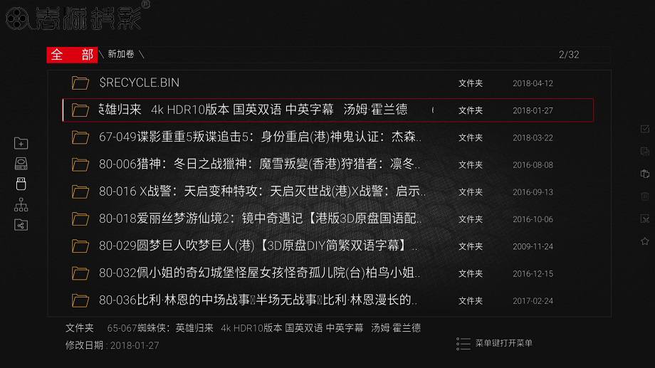 在CYZ18的开机桌面的左侧,就是海报墙入口。右侧第二个入口是常规的文件管理入口,在常规的文件管理入口,硬盘里每部影片的排序是是以文字方式上下随机的,没有分类,不便了解影片的性质。如下图:
