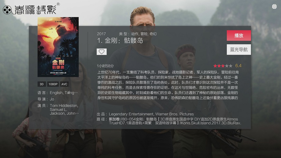 包括了影片的宣传海报、是否2D\3D,影片分辨率、视频格式、语言、导演名称、主演名称;拍摄年份、影片名字、时长、内容介绍、播放和蓝光导航入口等,视频特性跃然面前。