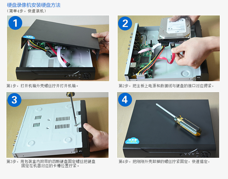机器发货的时候,已经在主板上插好了接硬盘的电源线和数据线,打开WHD-01的上盖,将3.5寸的SATA硬盘芯分别接入电源线和数据线,支持接入2块硬盘,每块可以3TB,配件盒里有固定硬盘的螺丝,在反面固定好螺丝,盖上仓盖。单路录像一个小时占用1.8GB左右的硬盘空间。