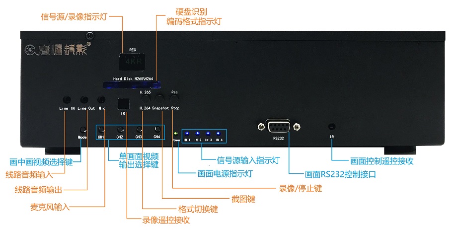 机器前面板左侧上部,分别有3.5音频线路输入、音频输出、耳麦输入接口;遥控接收窗;H265/H264选项按键、截图按键、录像开始/停止按键。本机按键,手感好,反应灵敏!