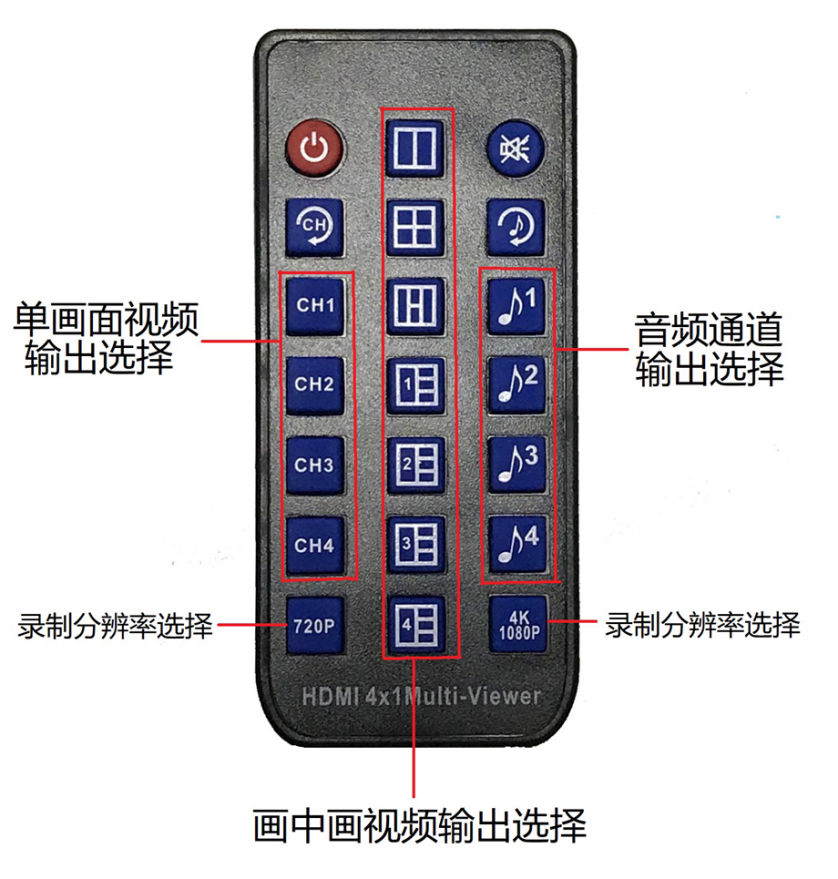 HDT105机器前面板具有简洁明晰、反应快捷的操作按键。可以一键开启或者停止录像;可以一键截图;可以一键切换H265/H264格式。可以一键切换显示模式;可以一键切换音频输入模式。同时,随机配有2个功能简洁、小巧精致的遥控器。1个是录像功能遥控器(如下图);1个是画面模式、音频选择遥控器(如下图)。
