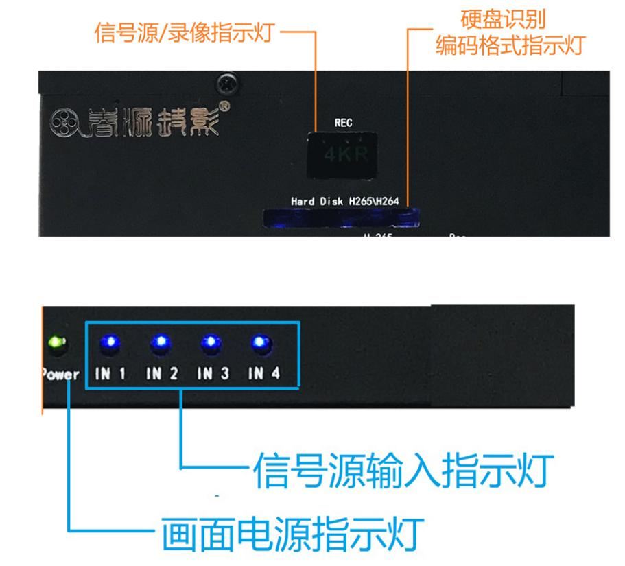 上面有分辨率和录像指示灯、中间有硬盘和格式指示灯。