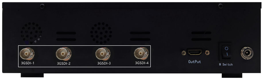 尾板分别有硬电源开关、5V2A电源插口、1个HDMI输出接口、4个3G-SDI输入接口。
