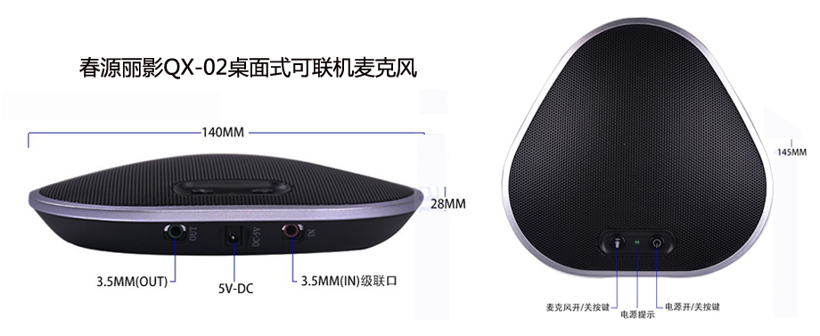 QX-02全向麦克风,既可以吊装也可桌面置放,可以有效接收周围2-5米的人声,支持多台机联。