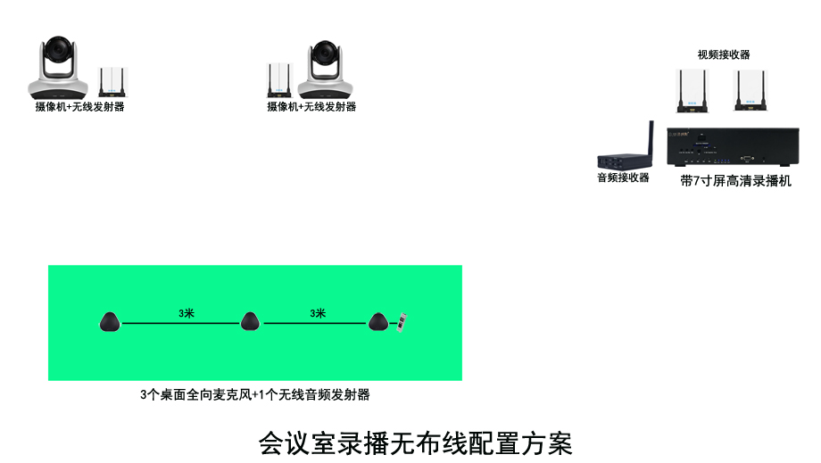 有些会议室,尤其是已经装修好的会议室,后期添加会议录播设备的时候,如果使用有线配置方案,不仅破坏了会议室的整体观感,也增加了施工的麻烦,为此,春源丽影推出了无布线录播设备配置方案,本文以中小型会议室、几十个人参会的长条形会议桌为例,介绍本套录播设备的配置方案。