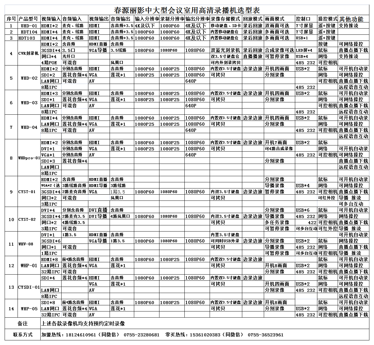 中大型会议室用高清录播机选型表