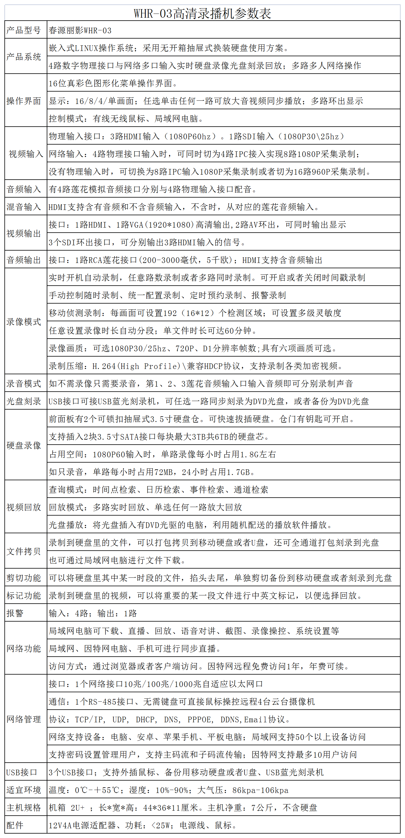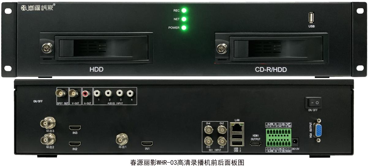 春源丽影WHR-03多功能高清硬盘录播机,支持3路HDMI、1路SDI输入接口,兼容各类高清摄像机、视频会议终端设备、各类广告机、电视播放机等接口输入录制;也支持多达16路网络IPC信号输入录制;置入了双带锁扣抽屉式硬盘仓,硬盘录像方便,USB光盘刻录便捷,不仅支持本机操控,也支持局域网电脑操控,还支持因特网远程直播。输入分辨率高,录制清晰度好,操控便捷,使用方便,而且产品售价与网络上那些价格昂贵的录播机相比,性价比高的多!该产品对于需要多路HDMI同时录制的用户,如多台视频会议设备同时录制、多间会议室同时录制、多台网络广告播放机同时录制以及大中型会议室录制、医疗手术示教录制、公检法问询录制、投招标室录制、教学讲课录制、舞台演艺录制、体育赛事录制、电视节目转播录制等领域,以及需要录制多台网络IPC信号的用户,具有极高的使用价值!