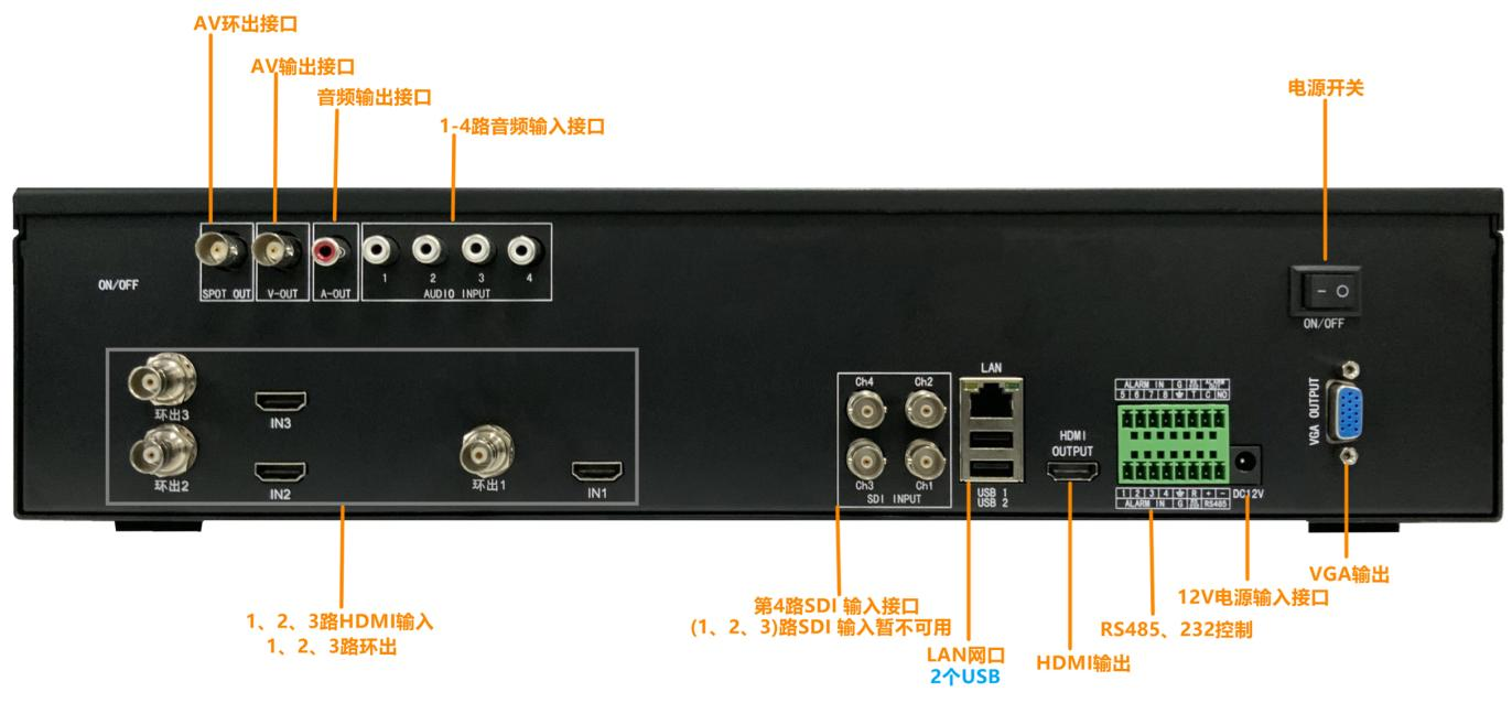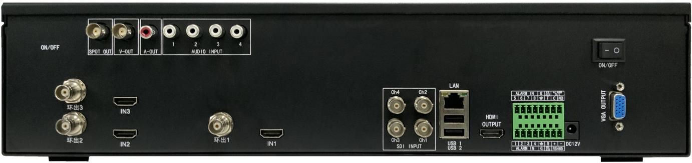 机器左下侧,有3个HDMI输入接口,是本机的第一、二、三视频输入通道,支持1080P60hz输入,支持含音频输入。每个HDMI左侧有一个SDI环出接口,可实时环出这3路HDMI输入的信号。
