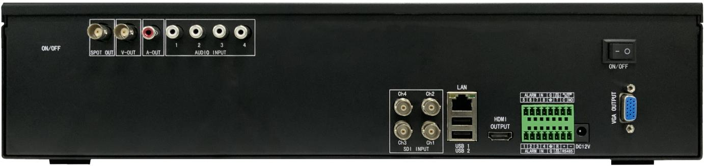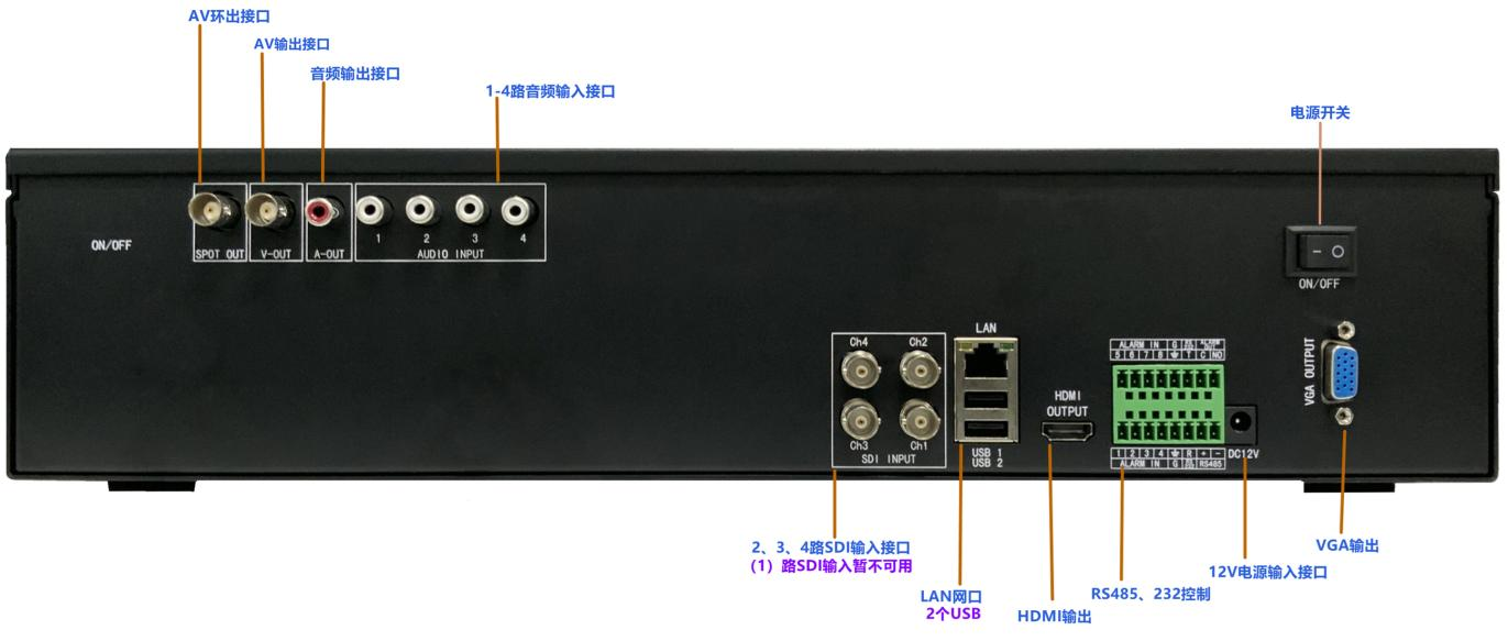 有1个千兆自适应LAN网口,可接路由器或者交换机;有2个USB接口,可接移动硬盘、鼠标进行文件备份;1个HDMI输出接口,可含音频输出4个通道输入的音视频画面,支持16/8/4/1画面显示;有RS485、232协议控制接口,可接入并操控云台摄像机;有1个12V4A的电源插口;1个硬电源开关;右边1个VGA输出接口,可与HDMI同步输出显示画面。