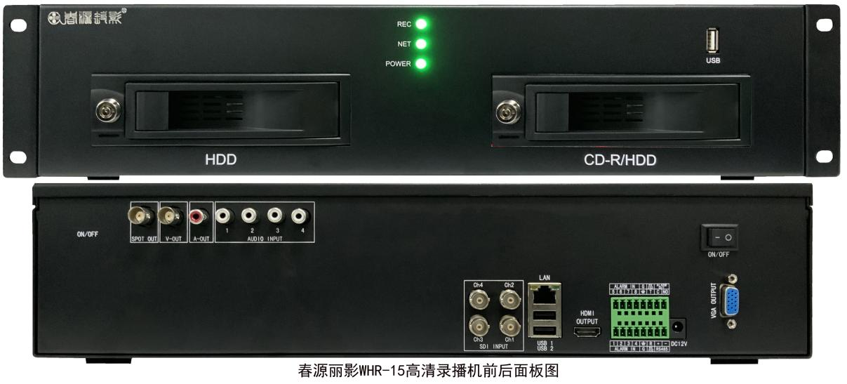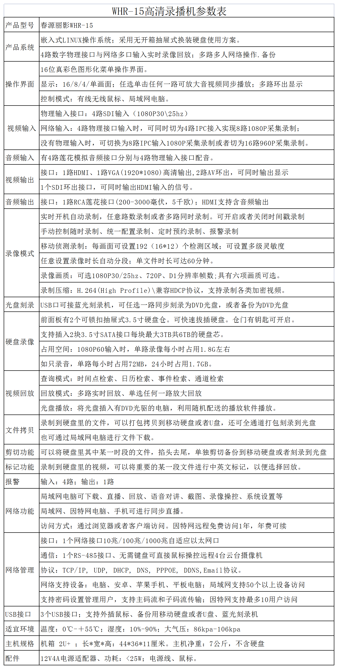 WHR-15机型,支持4路SDI输入、16路IPC网络输入。嵌入式LINUX操作系统,开创性无开箱用机方案,双抽屉式带锁扣硬盘安装方式,不仅支持硬盘录像,也支持USB外接蓝光刻录机刻录光盘;支持直接接显示器或者电视机全功能操作,也支持远程网络操控。机器具有多路分别配音、文件剪切、重点标记等丰富的功能。产品广泛应用于多间会议室同时录制、法庭审讯录制、投招标室录制以及重要领域的大中型会议室、智慧课堂、舞台演出、体育比赛、手术示教等场合的高清硬盘录播。
