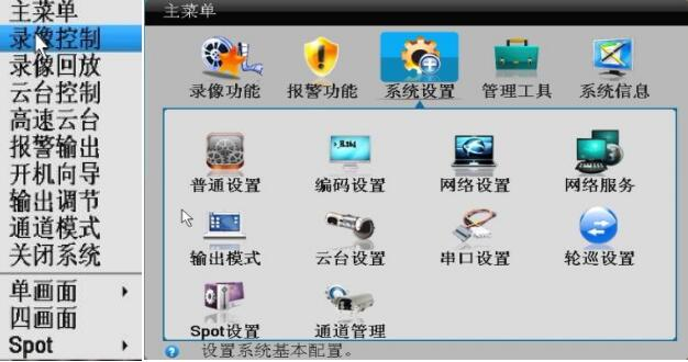 录播机接电视机后,鼠标点右键即可进入快捷操控菜单。如录像控制、回放、云台控制、输出调节、通道模式、画面调节、关闭系统等。点击主菜单,则进入更具体的系统设置等界面。