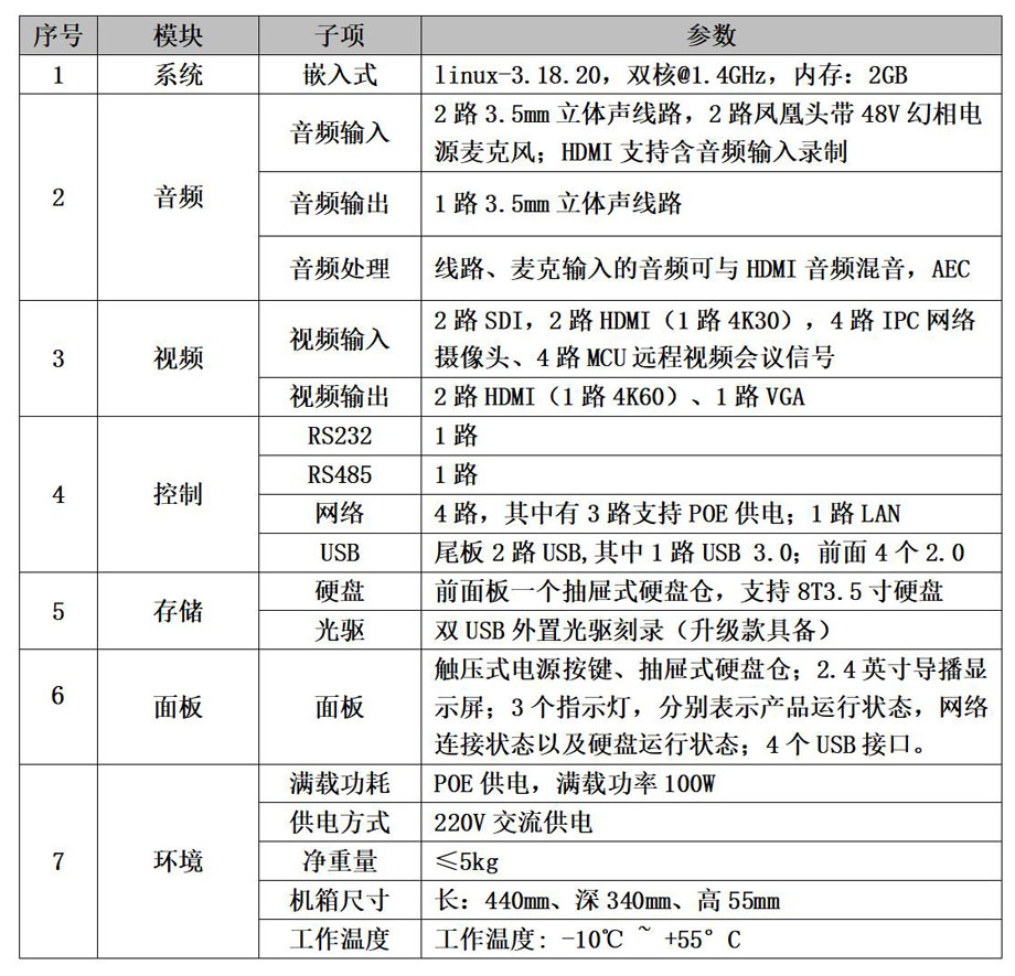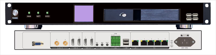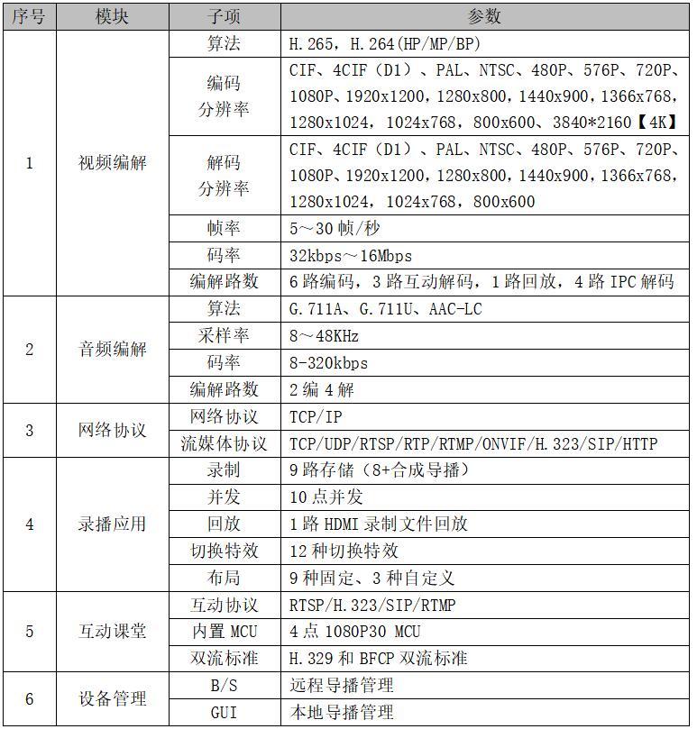 1.高清画质:高清视频输入,输出,编码,解码,录制,最高支持4K画质。 2.视频处理:4路物理视频源和4路网络视频源输入,4路MCU远程视频会议信号输入;1路USB视频源输入;2路HDMI、1路VGA视频输出,2路画面合成(本地画面合成、远程画面合成、本地远程混合合成录制以及导播)。 3.音频处理:支持音频输入、输出,混音,回声消除。HDMI音频可与麦克、线路输入音频混音录制。 4.可编程中控:开放的可编程中控,支持RS232/485/USB/TCP/UDP等多种接口。 5.高清录播:多任务录制/直播/点播/回放/下载/特效切换/自选择存储空间。 6.互动终端:支持RTSP/RTMP /H.323/SIP等多协议混合远程交互模式。 7.MCU管理:单机4点MCU会议,无缝对接主流第三方MCU或终端。 8.编解算法:H.265/H.264视频压缩算法,AAC/G.711音频压缩算法。 9.流媒体协议:支持TCP/UDP/RTSP/RTP/ RTMP/ONVIF/H.323/SIP/ HTTP协议。 10.设备管理:B/S,GUI触控等多种可视化导控管理。