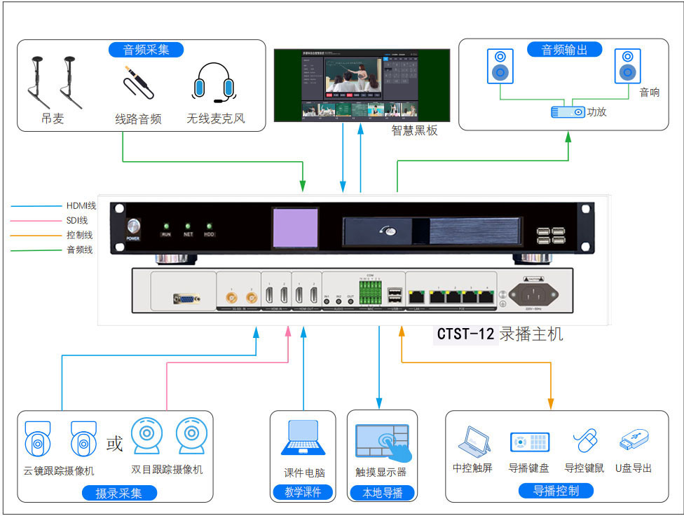 CYST-12高清录播机,由深圳春源丽影电子科技有限公司研发推出,主机采用纯嵌入式系统架构,具备视频、音频、中控、录播、视频会议,MCU、POE交换七大功能,是一款专为教育、会议、庭审行业打造的常态化录播主机,可应用于课堂录制、互动教学,微课制作、本地会议、视频会议等应用场景。主机内嵌双导播软件,实现多画面预览、录播、导播、特效切换,跟踪设置,字幕,摄像机控制,外设中控,点播回放,设备管理。