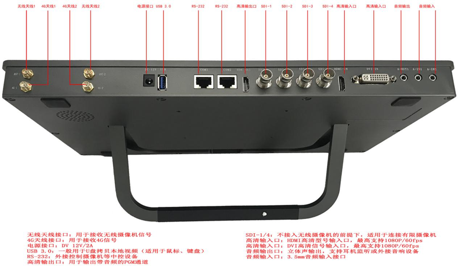 4. 视频输入接口:4路HD SDI视频输入接口、1路HDMI视频(1080P)输入接口、1路DVI输入