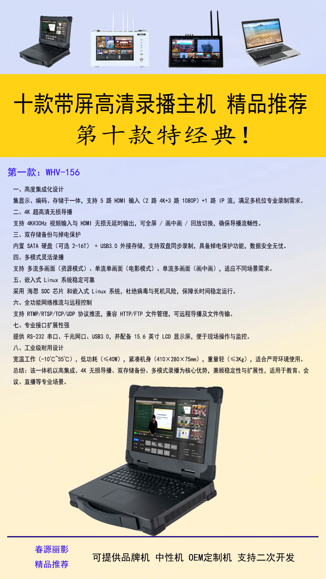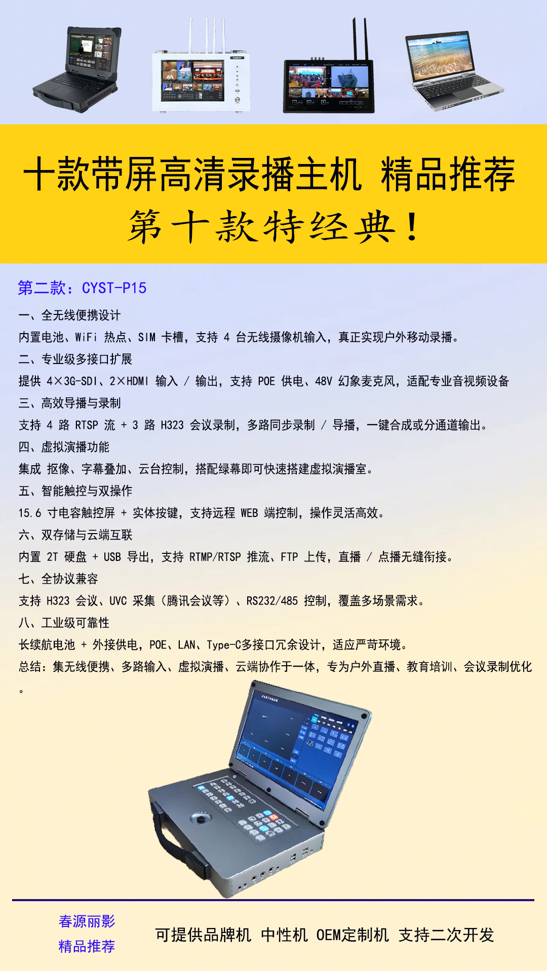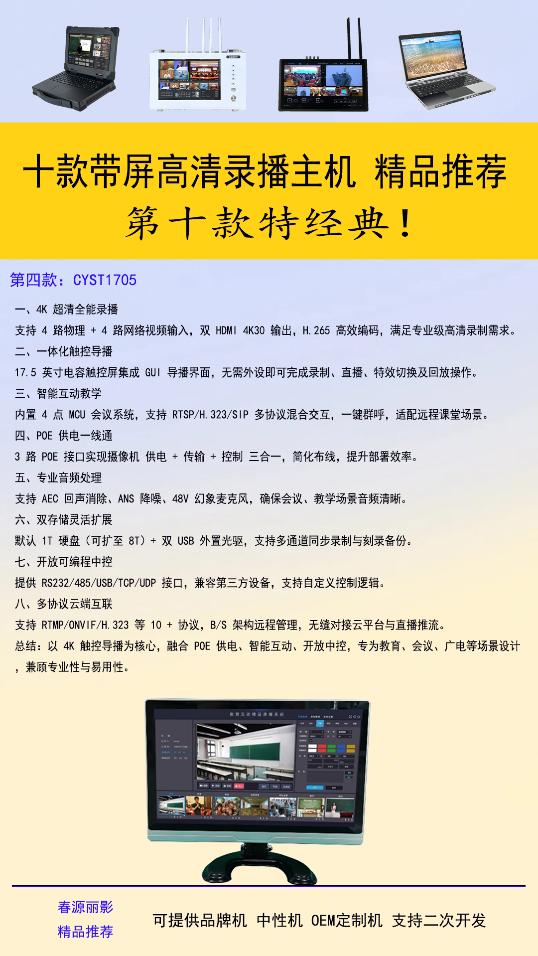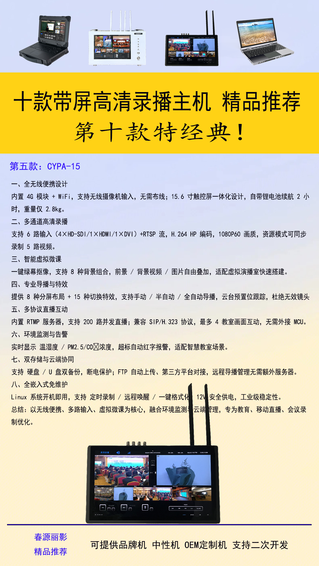 春源丽影作为专业录播设备制造商,推出了覆盖多领域应用的10款带屏录播一体机产品,满足从专业演播到移动便携的全场景需求。该系列产品均采用工业级嵌入式架构,配备触控显示屏,支持多路音视频输入、智能导播、直播推流等功能。