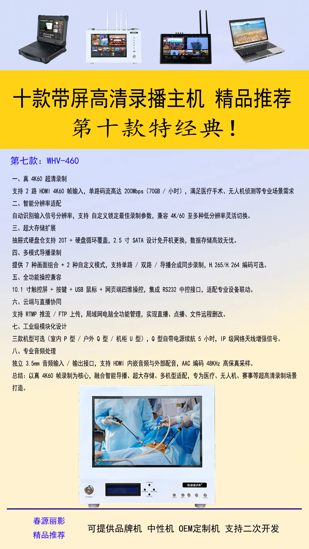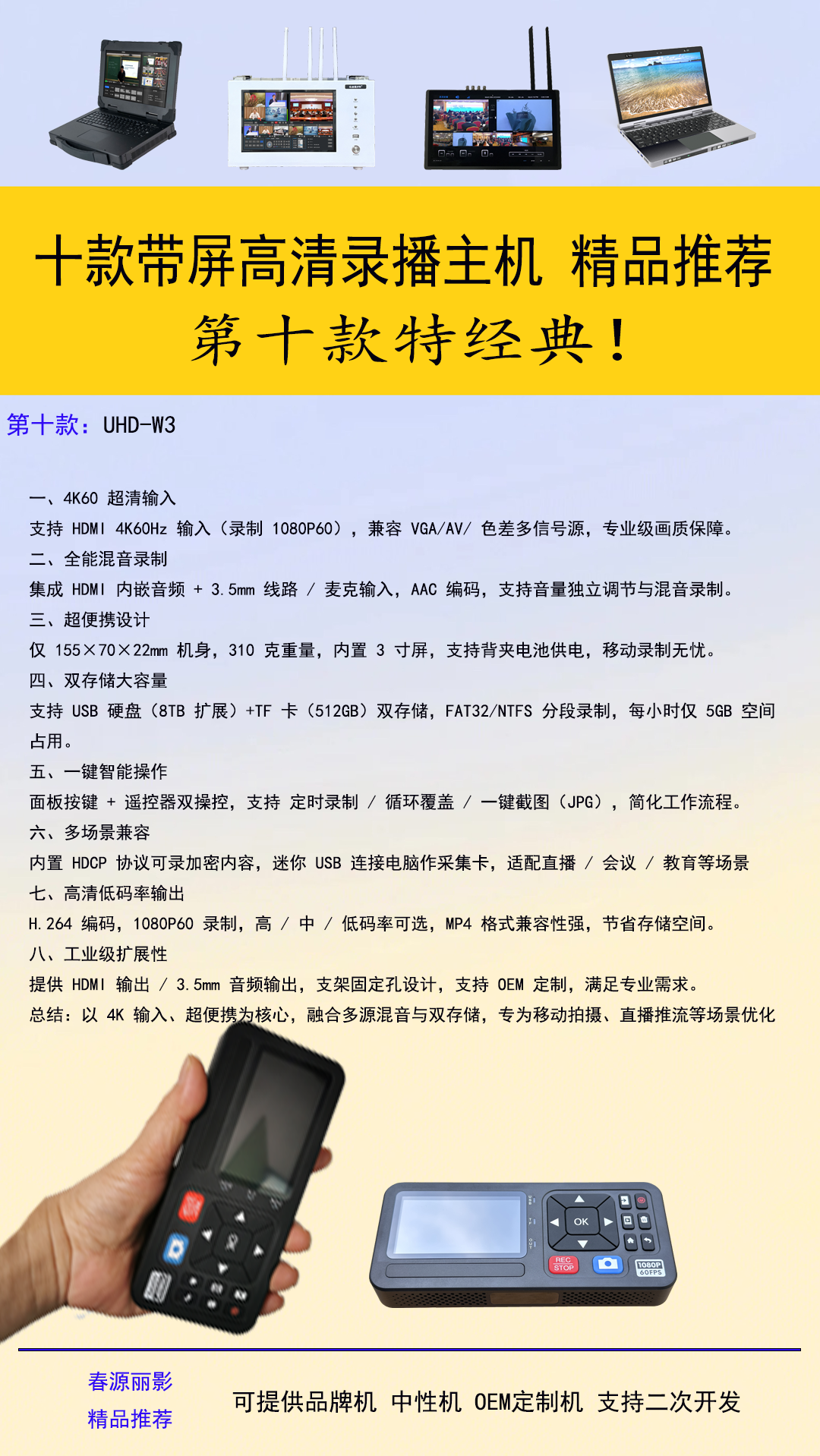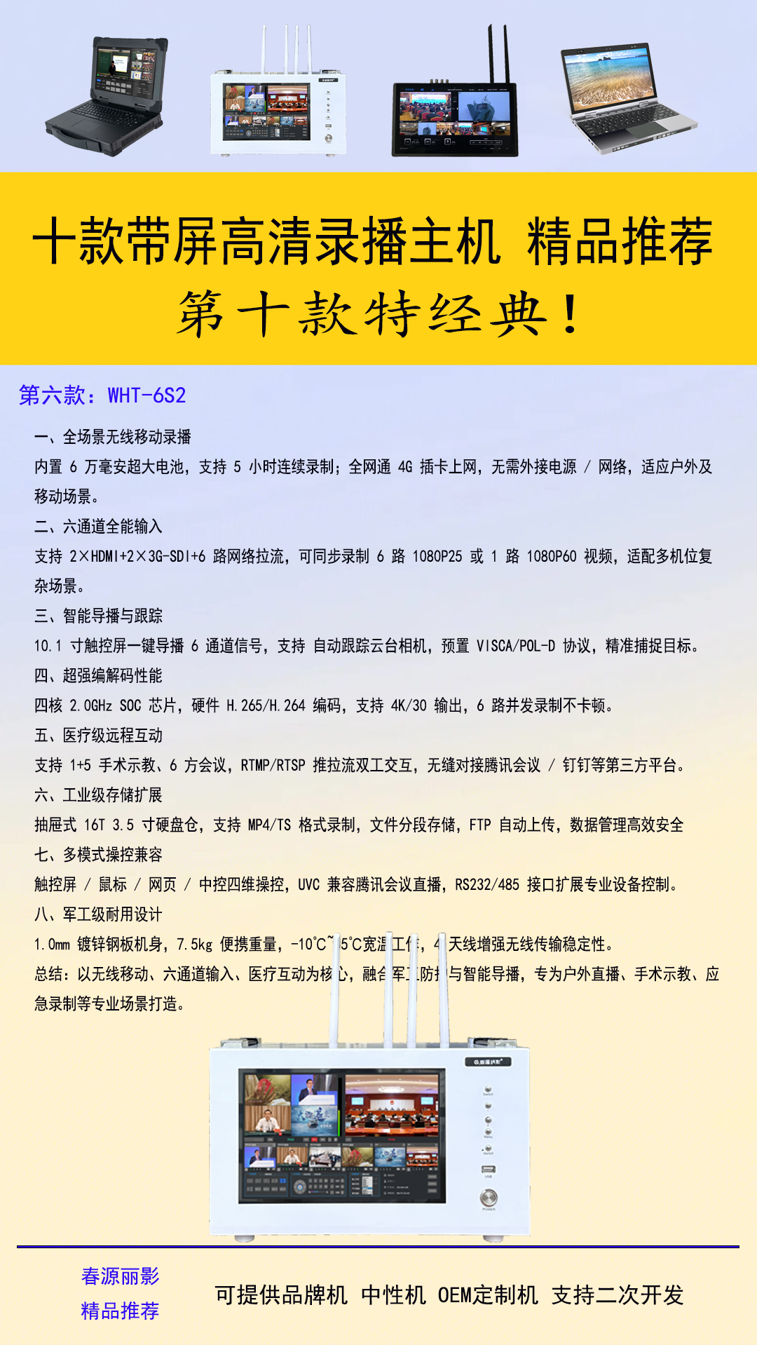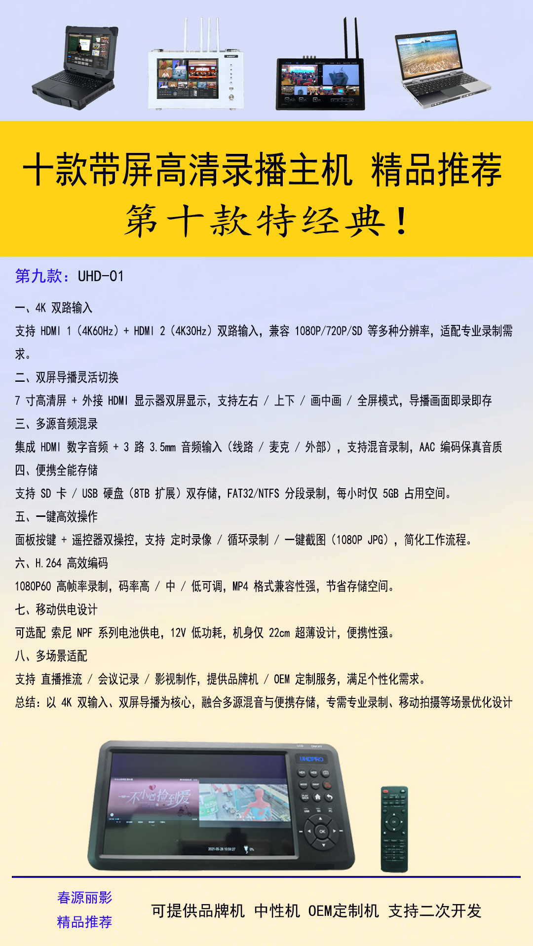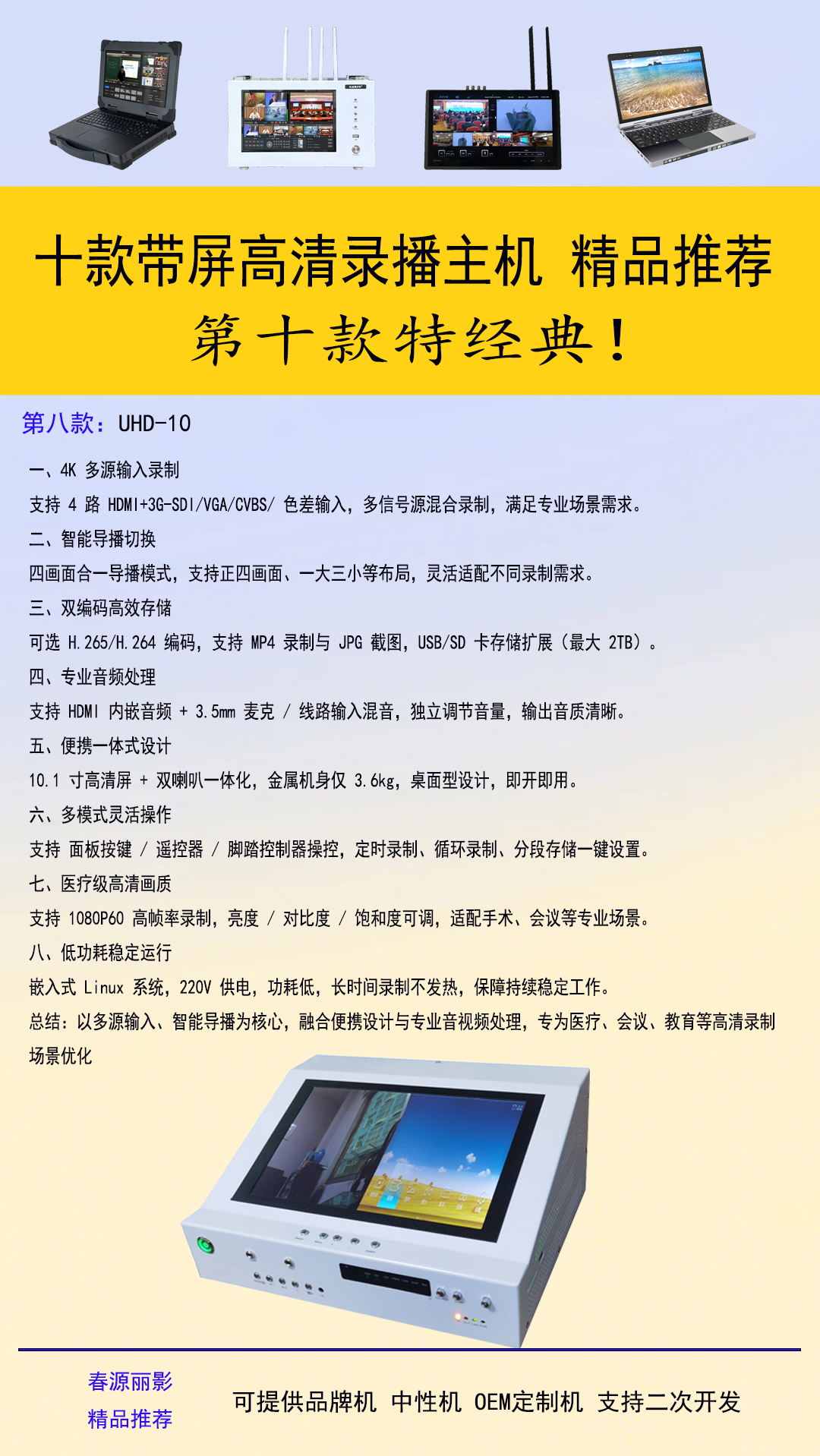 春源丽影作为专业录播设备制造商,推出了覆盖多领域应用的10款带屏录播一体机产品,满足从专业演播到移动便携的全场景需求。该系列产品均采用工业级嵌入式架构,配备触控显示屏,支持多路音视频输入、智能导播、直播推流等功能。
