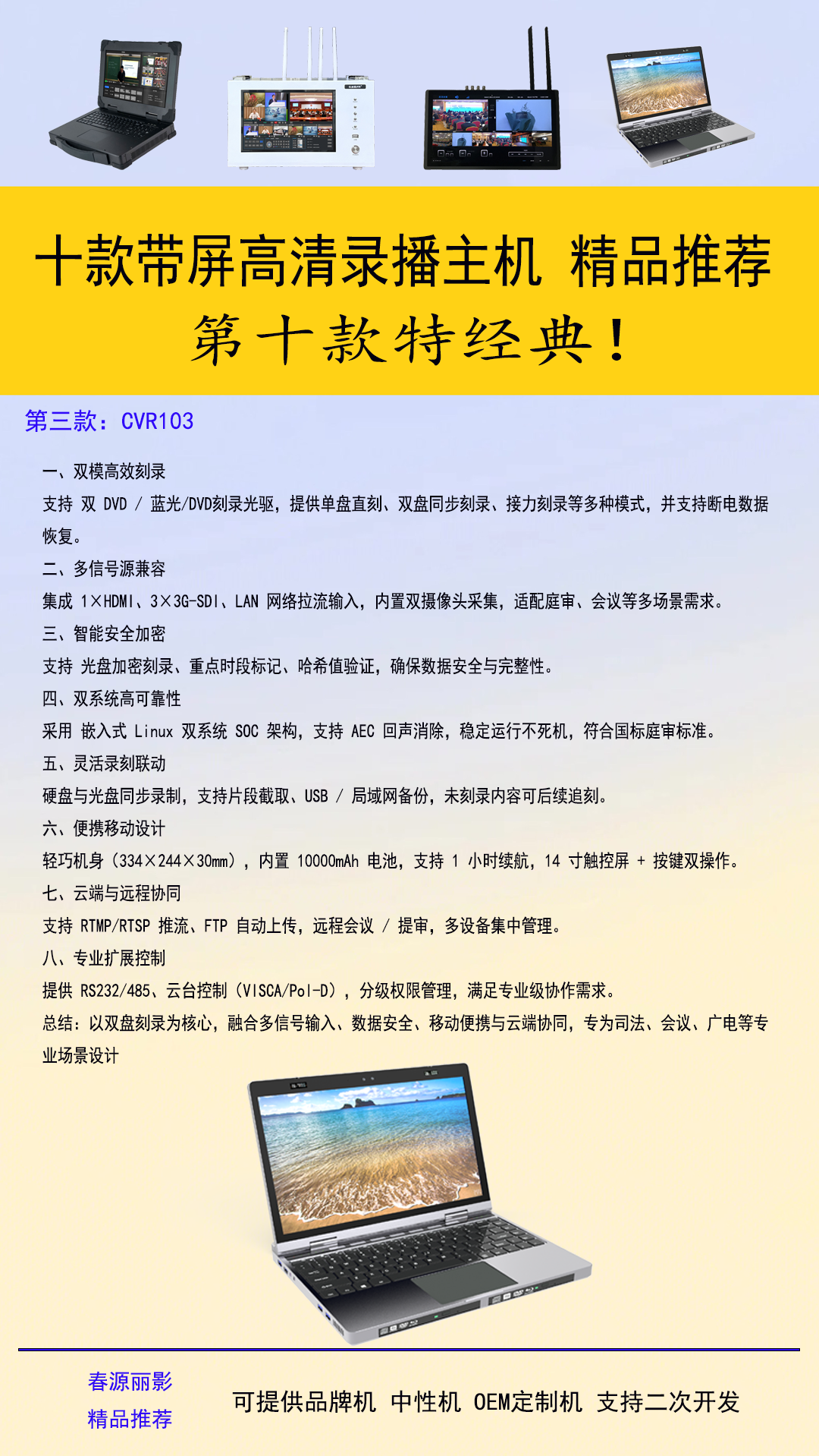 产品线包含:支持5路HDMI输入的翻盖式专业录播机、17.5寸大屏的CYST1705会议录播机、15.6寸平板设计的CYPA-15移动录播机、双光驱刻录的CVR103庭审专用机、6通道输入的WHT-6S2医疗示教机、4K60帧超高清录制的WHV-460专业机型、4路HDMI导播的UHD-10手术录播机、双屏操作的UHD-01便携机型、仅310克重的UHD-W3迷你录播机,以及支持无线多机位的CYST-P15虚拟演播系统。
